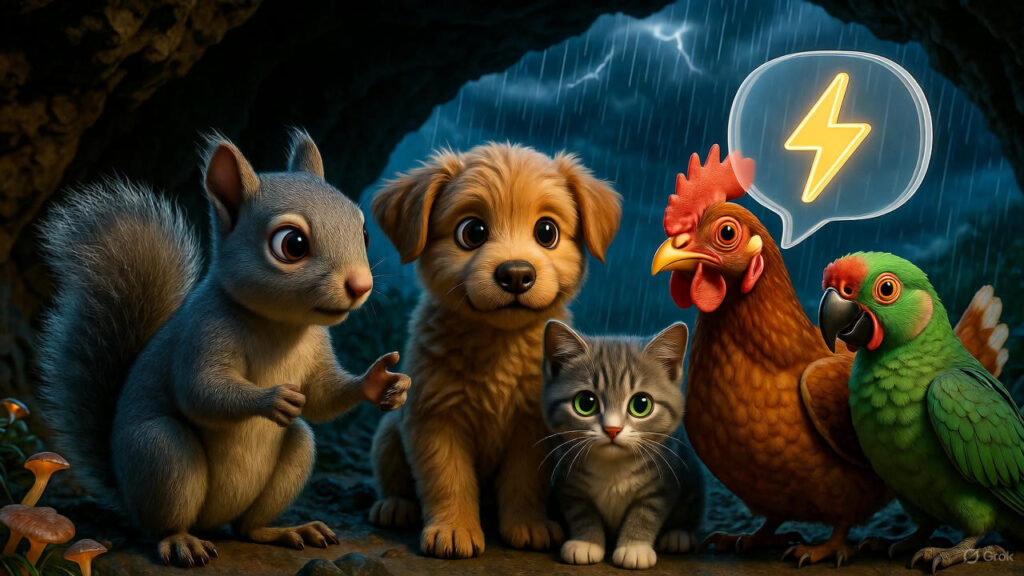 அப்பத்தான் திடீர்னு மழை பெய்ய ஆரம்பிச்சுச்சு தொடர்ந்து இடிச்சத்தம் கேட்க ஆரம்பிச்சதும் நான்கு காட்டுமிருகங்களும் ரொம்ப பயந்து போச்சுங்க என்ன இதுக்கே பயப்படுறீங்க இதுக்கு முன்னாடி இடிச்சத்தம் நீங்க கேட்டதே இல்லையா அப்படின்னு கேட்டுச்சு அந்த காட்டு அணில்